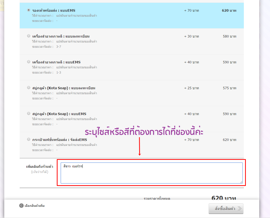 ลูกค้าสามารถระบุไซสืหรือสีไดที่ช่อง"เพิ่มเติมถึงร้านค้า" ในขั้นตามของการสั่งซื้อสินค้าตามรูปตัวอย่าง